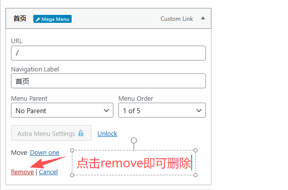 点击“Remove”或者“删除”按钮,即可将菜单项删除。