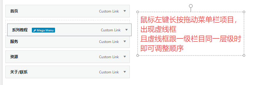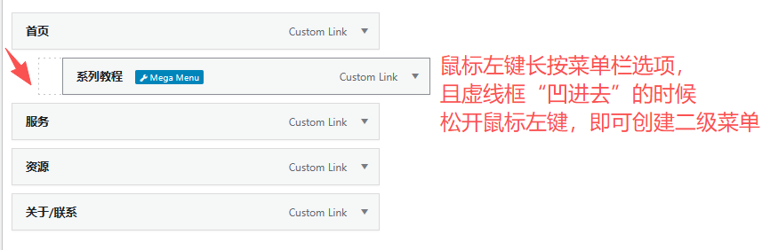 比如说我这里有两个选项,我想要给“首页”下增加一个“系列教程”的选项,那么我只需要用鼠标左键长按拖动至出现一个“凹进去”的虚线框,此时松开鼠标左键即可为首页增加层级。