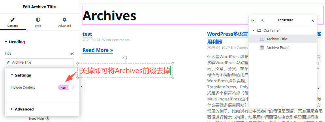 5、設定Archive Title。Archive Title是我們文章分類的標題,但是我們直接將這個小部件拖曳到Elementor編輯器的話,會預設有一個「Archives」的前綴。