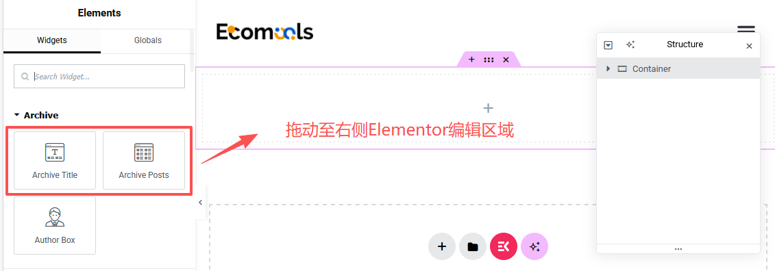 4.將Archive Title和Archive Posts拖曳至右側編輯區域。